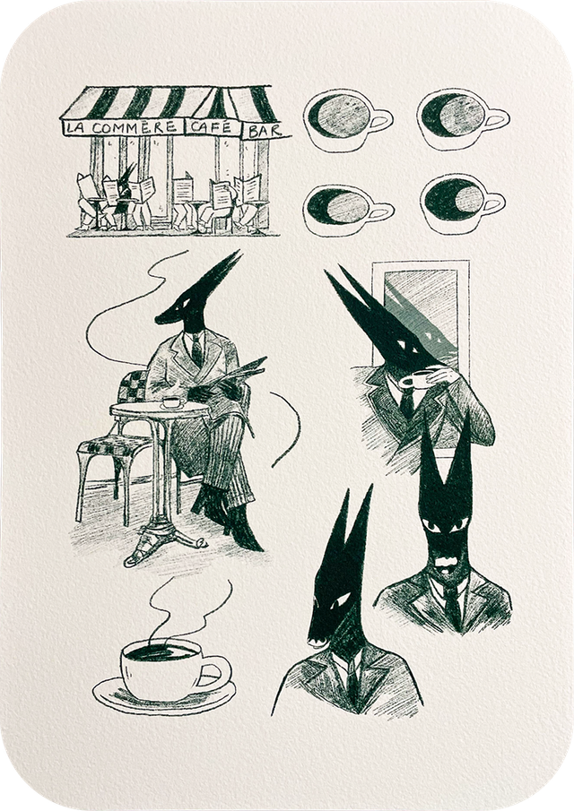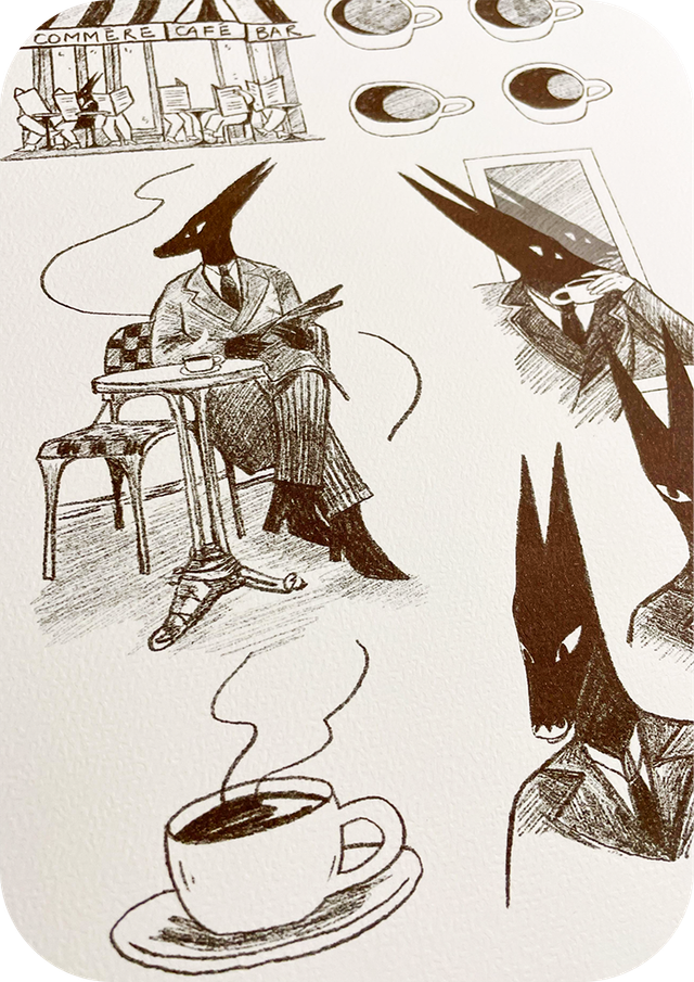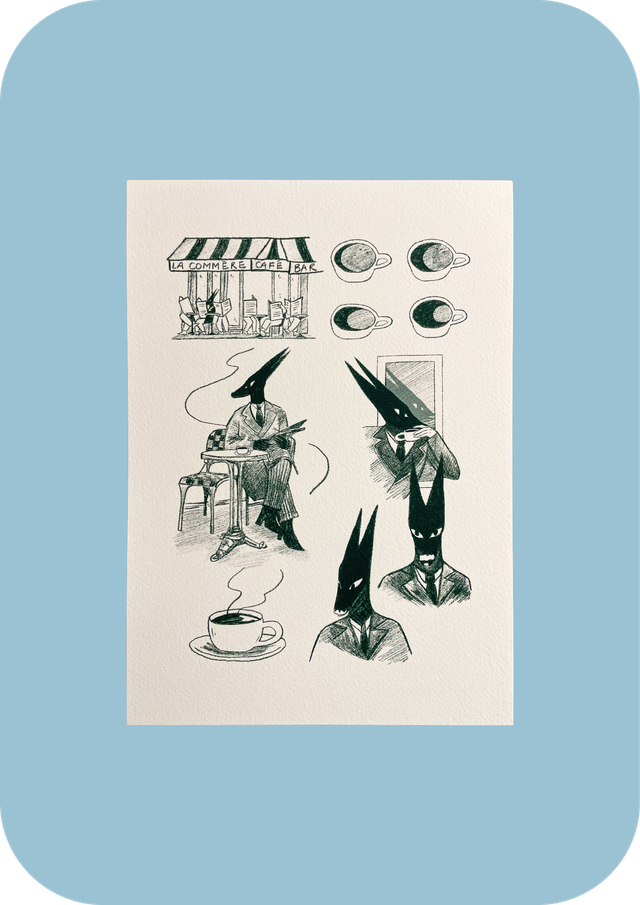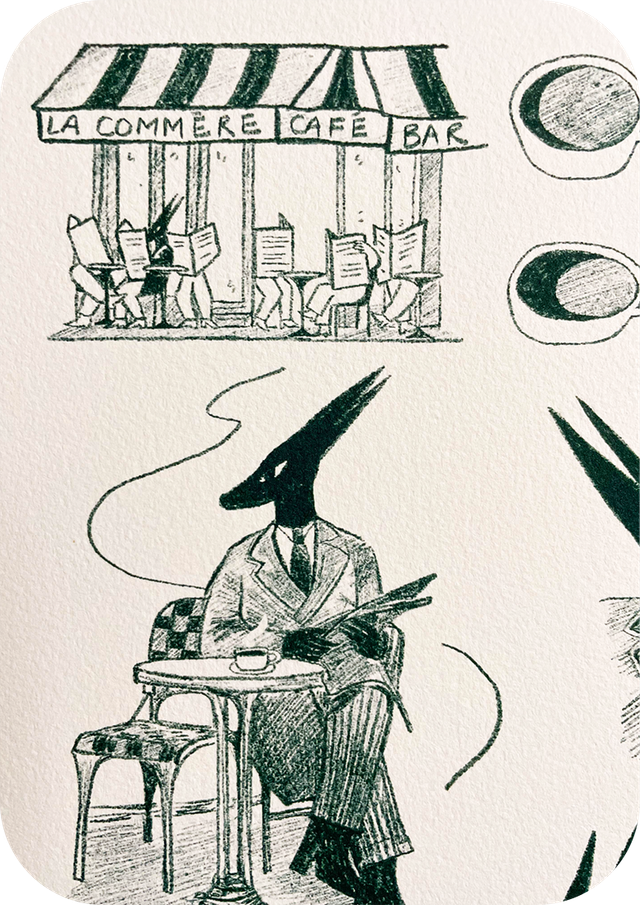 Au café La Commère, la vie s’éveille doucement dans la banalité du petit matin. En terrasse, les journaux bruissent et les cafés se dégustent en silence.. jusqu’à ce que la mousse, dessinant de délicats croissants de lune, fasse glisser la scène vers une dimension où le réel et l’imaginaire se rencontrent.